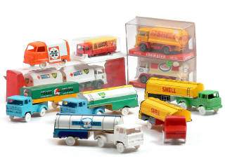 comprend : BERLIET GAK semi-remorque citerne 'SHELL', BERLIET STRADAIR semi-remorque citerne 'SHELL', BERNARD semi-remorque bâché 'TRANS EUROPA', BERNARD semi-remorque citerne 'BP', BERNARD semi-remorque citerne 'FRANCE LAIT', MERCEDES citerne avec remorque 'BP', MERCEDES citerne 'ESSO', MERCEDES citerne 'SHELL', RENAULT ESTAFETTE 'EXPERT' & SAVIEM bâché 'JOE CIRCUS' - on y retrouve les marques : CHAMPION, MAJORETTE & SESAME - 4 modèles avec boîte - un véhicule en état 'C' & quelques traces d'oxydation sur un autre