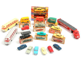 états de 'A' à 'C' - série MICRO MINIATURES - miniatures reproduisant les modèles : CITROËN, RENAULT, SIMCA, PEUGEOT, PANHARD, MERCEDES, SAVIEM & UNIC - 2 voitures de la série 'MINI JET' - 11 modèles avec boîte - quelques carrosseries très légèrement déformées - une boîte en état '-d'