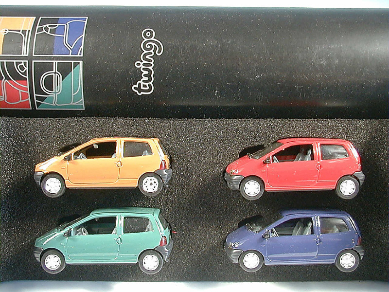 Coffret-tube présentant 4 TWINGO (ocre, brique, vert & violet) - il s'agit des 4 couleurs initiales de ce modèle