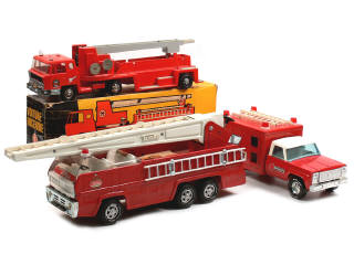 états de 'B' à 'C' - comprend un BERNARD semi-remorque grande échelle de pompiers (transformé) & 2 véhicules de pompiers américains - on y retrouve les marques CHR, TONKA & NYLINT TOYS - un modèle avec boîte - petits manques