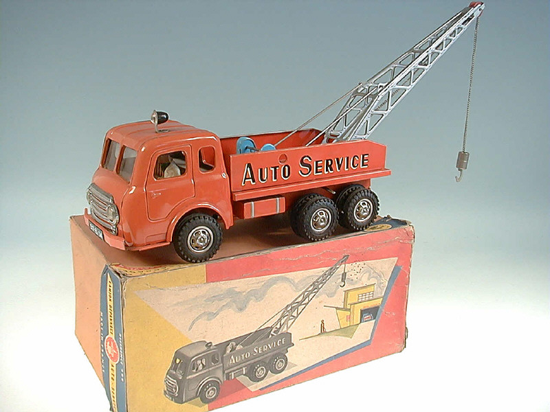 longueur 28 cm - moteur à clef (fonctionne) - manque manivelle - légère décoloration de la cabine - avec sa clef