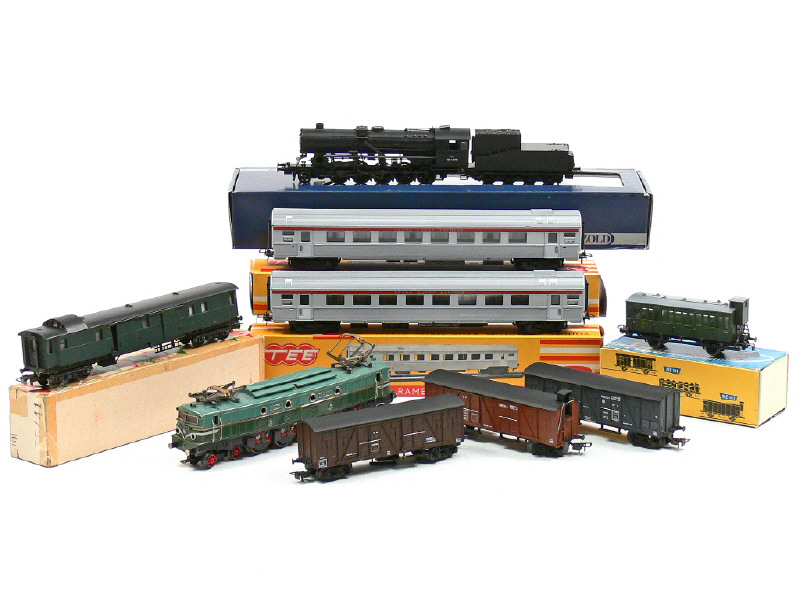 DIVERS (Ecartement HO) Ensemble d'une motrice électrique, une locomotive à vapeur, 3 voitures de voyageurs, 3 wagons & un fourgon