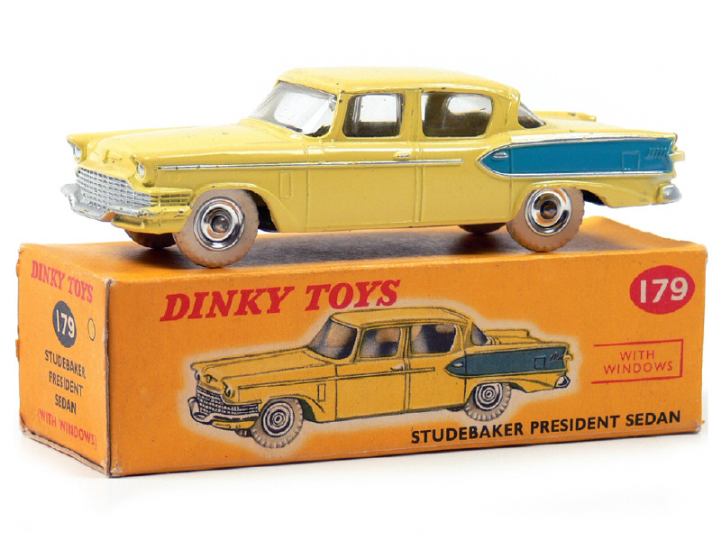DINKY TOYS (GB) 179 STUDEBAKER PRESIDENT Sedan jaune citron & filets bleus, jantes aluminium