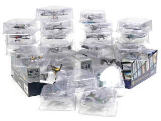 on y retrouve les appareils : LOCKHEED P38 LIGHTNING, REPUBLIC F84, ALPHA JET, F22 RAPTOR, HEINKEL HE111, F-104 STARFIGHTER, MITSUBISHI ZERO, HAWKER HUNTER, DE HAVILLAND MOSQUITO, FB MKVI, F4F WILDCAT, CASA C101, BAe HAWK, JUNKERS JU87 STUKA, AICHID3A1 type 99 VAL, GRUMMAN INTRUDER, NEWPORT 28, ILYUSHIN IL.II SHTURMOVIK, F/P80, SOPWITH CAMEL (une roue désolidarisée d'origine) & SUPER ETENDARD - on y joint un MESSERSCHMITT BF 109 & un REPUBLIC P-47D THUNDERBOLT de la marque ARMOUR COLLECTION à l'échelle 1/48ème