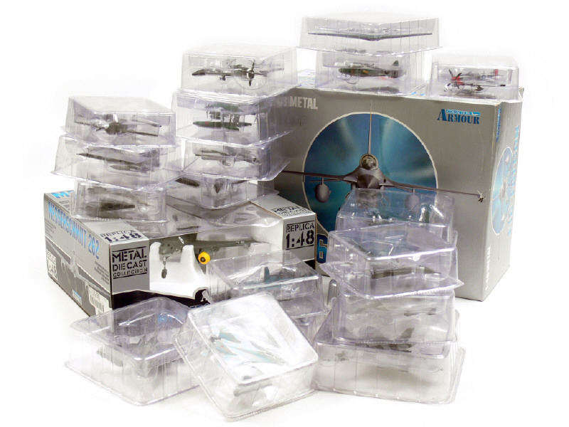 on y retrouve les appareils : DASSAULT RAFALE, FIAT CR.42 FALCO, NORTHROP B-2, AVRO FALCON, MIG 29, A-10 THUNDERBOLT WARTHOJ, P51D MUSTANG, F9F PANTHER, TORNADO, MIRAGE 2000, P-47 THUNDERBOLT, P-40 B, KAWANISHI N1K1 KYOFU, F-18 HORNET, MITSUBISHI G4M2 BETTY, F-4 PHANTOM II, MIRAGE III-C, F-86F SABRE, F16 FALCON & F-15 EAGLE - on y joint un MESSERSCHMITT ME262 & un F-16 FALCON de la marque ARMOUR COLLECTION à l'échelle 1/48ème