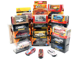 miniatures reproduisant les modèles : ALPINE, AMERICAN LAFRANCE, AUDI, BMW, BUGATTI, ASTON MARTIN, CHEVROLET, CHRYSLER, FERRARI, FIAT, JAGUAR, LAND ROVER, LOTUS, MG, MERCEDES, PORSCHE, PEUGEOT, RENAULT, TOYOTA, TRIUMPH, JEEP & VOLKSWAGEN - on y retrouve notamment les marques : SOLIDO, CONRAD, BRUMM, BURAGO & VITESSE - 4 véhicules sans boîte