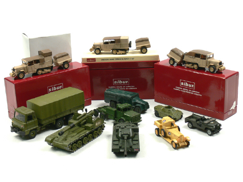 états de 'B' à 'R' - miniatures reproduisant notamment les modèles : CITROËN, FODEN, ROLLS ROYCE, JEEP, THORNYCROFT (manque remorque), CHIEFTAIN & FERRET - on y retrouve les marques : CORGI, DINKY TOYS GB, MATCHBOX, SIBUR & MEBETOYS - petits manques