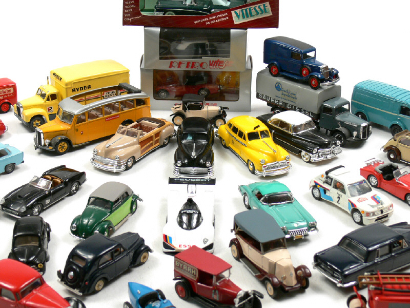 miniatures reproduisant les modèles : AUSTIN HEALEY, BUGATTI, BUICK, CITROËN, CADILLAC, CHRYSLER, CHEVROLET, FORD, MERCEDES, PEUGEOT, RENAULT, TALBOT, VOLKSWAGEN, FERRARI, TRABANT, ROLLS ROYCE, PANHARD, DELAGE & TRIUMPH - on y retrouve les marques : ELIGOR & VITESSE - 3 véhicules en boîte (dont une incomplète) - détails de peinture ajoutés