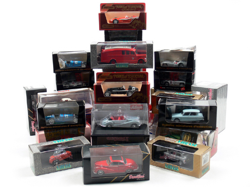 miniatures reproduisant les modèles : CHEVROLET, CITROËN, Mc LAREN, HISPANO SUIZA, MINI, TUCKER, FIAT, MERCEDES, BMW, MASERATI, BUGATTI, ALFA ROMEO, JAGUAR, MESSERSCHMITT, AUSTIN HEALEY, ERA, SAURER, RENAULT, PORSCHE, TRIUMPH, FORD & FERRARI - on y retrouve les marques : MODEL BEST, DINKY MATCHBOX, VEREM, VITESSE, BRUMM, MATCHBOX, DETAILCARS, SCHUCO & MINICHAMPS - une boîte en état 'c'