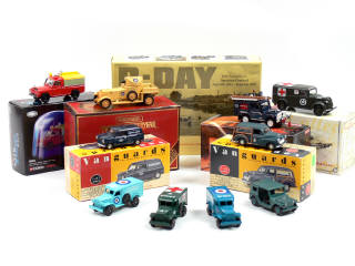 on y retrouve notamment les modèles : BEDFORD, AUSTIN, MORRIS, FORD, ROLLS ROYCE, DODGE, LAND ROVER, JEEP & GMC - on y retrouve les marques : CORGI, MATCHBOX MODELS OF YESTERYEAR, VANGUARDS & DAYS GONE - 3 véhicules regroupés dans un coffret (manque un modèle) & 4 sans boîte