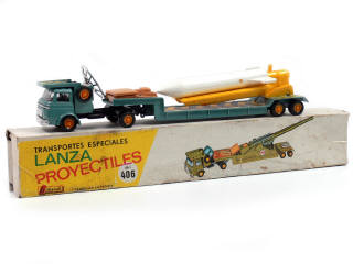 boîte de la référence 406 représentant un BERLIET GAK semi-remorque surbaissée porte-canon - charnière de coffre à outils cassée - fusée non d'origine