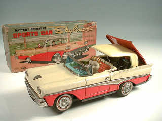 en tôle lithographiée - petites retouches - longueur 23,5 cm - moteur à pile (fonctionne) - en action, la voiture zigzague pendant que le conducteur tourne la tête, puis s'arrête pendant que la capote sort du coffre et se place - après une autre série de zigzag, le mécanisme s'inverse - SPECTACULAIRE !