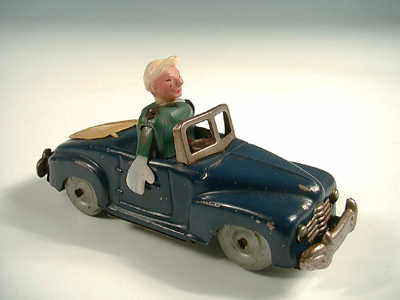 longueur 12 cm - moteur à clef (fonctionne) - en action, la voiture avance & le personnage lève & baisse le bras droit - inscription 'MADE IN OCCUPIED JAPAN' sur le plancher -