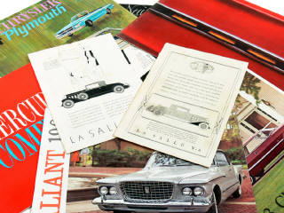 comprend : CHRYSLER-PLYMOUTH 1964, CHRYSLER 1962, MERCURY COMET 1962, CHRYSLER VALIANT 1961, CHEVROLET 1963, PLYMOUTH VALIANT 1962 & DODGE 1960 (en état 'c') - on y joint 20 publicités de magazines de voitures américaines des années 30