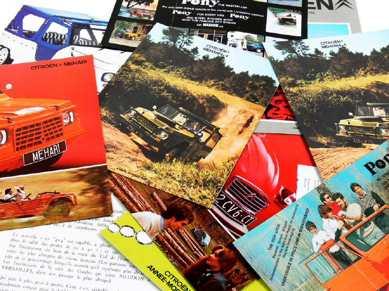 on y retrouve les modèles : MEHARI (la majorité des documents), MEHARI AZUR, MEHARI 4x4, 2CV, DYANE, AMI 8, LNA, 2CV 6, & PONY - on y joint 3 feuilles de présentation de la 2CV 4x4