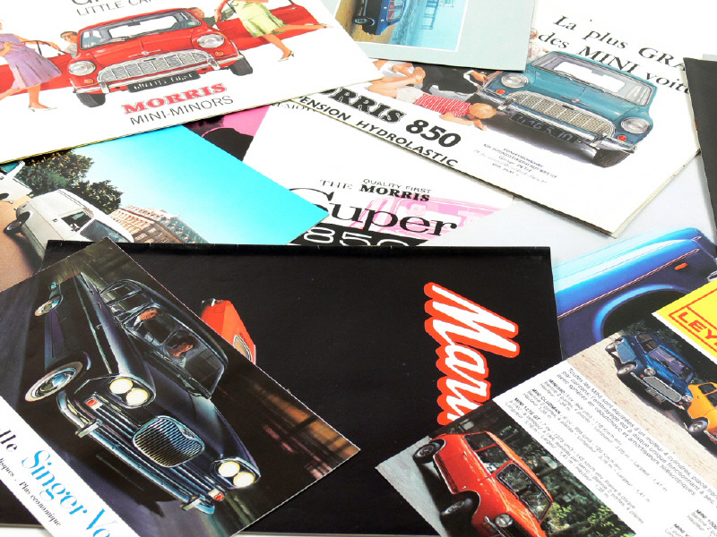 on y retrouve les marques & modèles : SINGER VOGUE, MORRIS SUPER 850, MORRIS MARINA 1300, MORRIS MARINA 1800, MORRIS MARINA 1800 TC, MORRIS MARINA coupé, MORRIS MARINA VAN, MORRIS MARINA pick-up, MORRIS MINI MINOR, MINI CLUBMAN, MINI 1275 GT, MINI COOPER, AUSTIN 1100 coupé, AUSTIN 1300, AUSTIN 1800, AUSTION HEALEY SPRITE, MGB, MGB GT, MGC, MGC GT, MORRIS OXFORD, MORRIS 1100, VANGUARD LUXURY SIX & JAGUAR XJ - on y joint 2 dépliants de coloris & un autre de tarifs