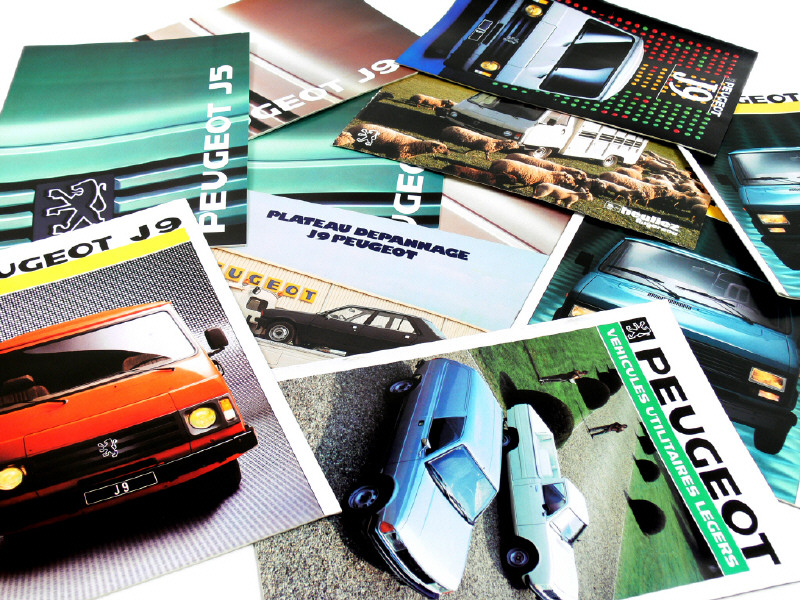 on y retrouve les modèles : 104 ZA, 305 BREAK SERVICE, 504 pick-up, 504 châssis-cabine, J5 & J9 - certains dépliants & catalogues présentent des réalisations des carrossiers POURTOUT, HEULIEZ, DURISOTTI & GRUAU