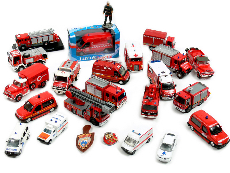 états de 'B' à 'R' - comprend des véhicules de pompiers & des ambulances - un modèle avec boîte & un autre sous blister - on y retrouve notamment les marques : SOLIDO, VEREM, CARARAMA, SIKU & NOREV - quelques véhicules transformés & quelques petits manques - on y joint une enveloppe de planches de décalques en partie utilisée, une figurine de la marque NEM, une épinglette, un insigne des 'SAPEURS POMPIERS DU LOIR & CHER' & 11 boîtes vides de la collection SOLIDO HACHETTE