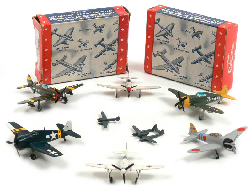 comprend : FOLCKE WULF FW187, FOLCKE WULF FW189, FOLCKE WULF FW190A, P47D THUNDERBOLT (2 exemplaires différents), GRUMMAN F6F HELLCAT, MITSUBISHI A6M2 ZERO & MIG 3 - on y retrouve notamment les marques : CHAUBET & COMET - 2 boîtes en état 'c'