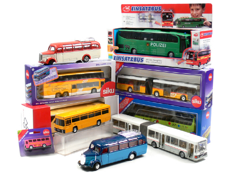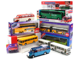 miniatures reproduisant notamment les modèles : MERCEDES (dont un en état 'D' avec manques & un autre avec boîte incomplète), STEYR, SETRA & VOLVO - on y retrouve les marques : DICKIE, NZG, CURSOR MODELL & SIKU