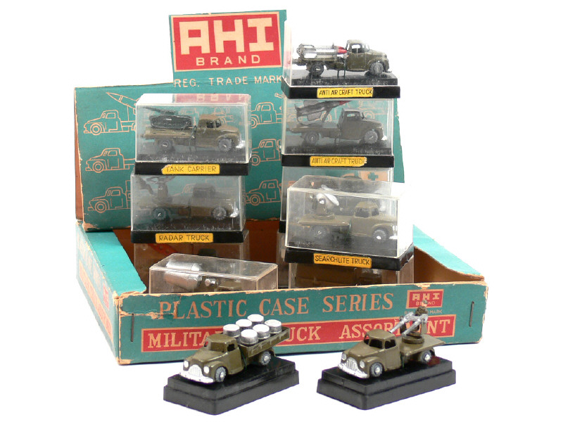 états de 'A' à 'C' - échelle HO - contient : projecteur antiaérien (un petit défaut de moulage), radar, ambulance, porte-char, dépanneuse, toupie à béton, bâché, lance-missile, lance-roquettes, porte-tonneaux d'essence, fardier avec grume & canon antiaérien - en boîte-vitrine individuelle (manque 2 étiquettes de socle) - fabrication des années 1950