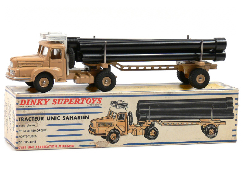 DINKY TOYS (FRANCE) 893 UNIC Saharien transport de pipe-lines (version avec jantes concaves & remorque ajourée) sable & blanc