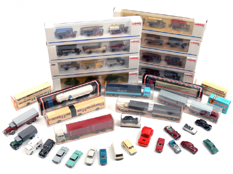 petites échelles - miniatures reproduisant notamment les modèles : RENAULT, VOLKSWAGEN, PINZGAUER, MERCEDES, CITROËN, BRABHAM, OPEL, TATRA, KRUPP, VOLVO & MAN - on y retrouve notamment les marques : MÄRKLIN, WIKING, PENNY, BREKINA, HERPA & ROCO - 18 véhicules sans boîte (dont un en état 'C') & 24 autres répartis en 8 coffrets