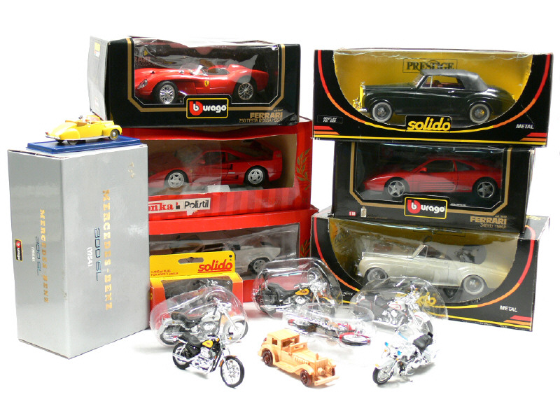 miniatures reproduisant notamment les modèles : FERRARI, HARLEY DAVIDSON, LAMBORGHINI, MERCEDES & ROLLS ROYCE - on y retrouve notamment les marques : BBURAGO, MAISTO, TONKA-POLISTIL, SOLIDO & EDITIONS ATLAS - 5 véhicules sans boîte & 7 à l'échelle 1/18ème