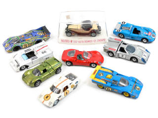 miniatures reproduisant les modèles : HOWMET, ALFA ROMEO, MATRA-SIMCA, CHEVRON, FORD-LOLA, CHAPARRAL, FERRARI & PORSCHE - un modèle en boîte & 2 autres avec petits détails de peinture ajoutés - 2 voitures de la marque CHAMPION