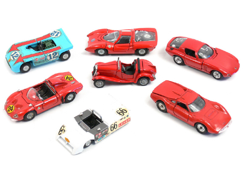 miniatures reproduisant les modèles : ALFA ROMEO, CHAPARRAL, FERRARI & PORSCHE - une voiture de la marque MATTEL - manque un sigle de capot & un pare-brise