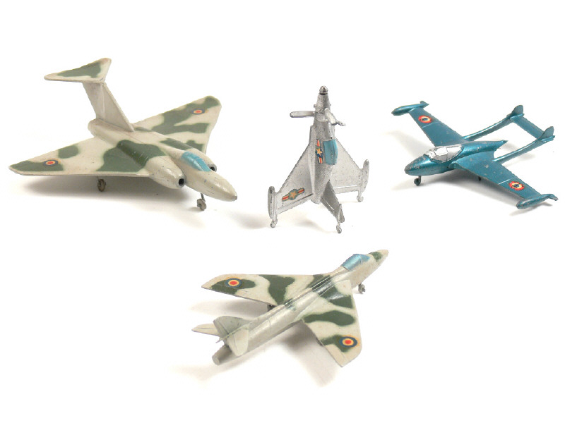 états de 'B' à 'D' - miniatures reproduisant les modèles : JAVELIN, HAWKER HUNTER, AQUILLON (manque une roue) & CONVAIR (de la marque MERCURY avec 3 pales d'hélices manquantes) - très légères traces de métal fatigue sur 2 modèles