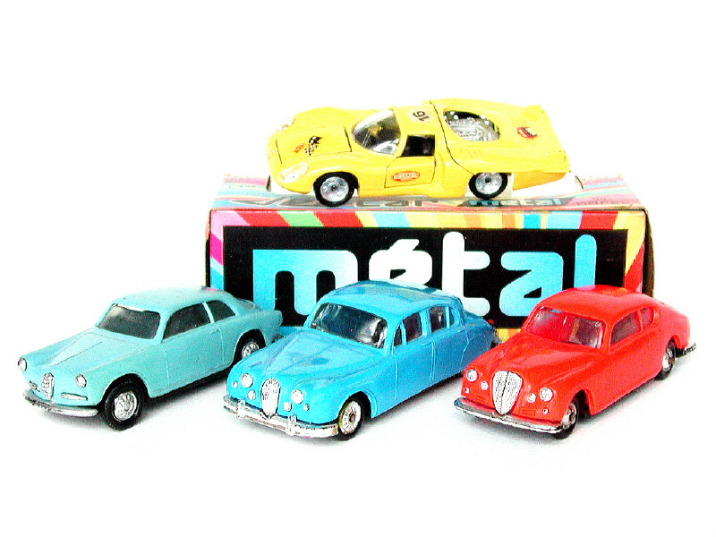 état de 'B' à 'C' - miniatures reproduisant les modèles : ALFA ROMEO 33, LANCIA AURELIA, ALFA GIULIETTA & JAGUAR 2.4l - 3 véhicules en plastique (petits manques) - une voiture en métal (avec boîte état 'b')